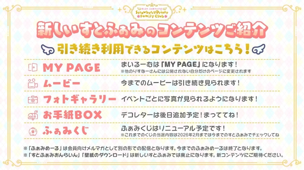 新しい「すとふぁみ」では、毎日アクセスして楽しめる「すとふぁみ占い」、ライブやイベントにあわせて交流できる「トークルーム」、誕生日に限定メッセージが届く「バースデーメール」、会員だけが視聴できる「すとふぁみ限定生配信」などの新コンテンツを導入しました。