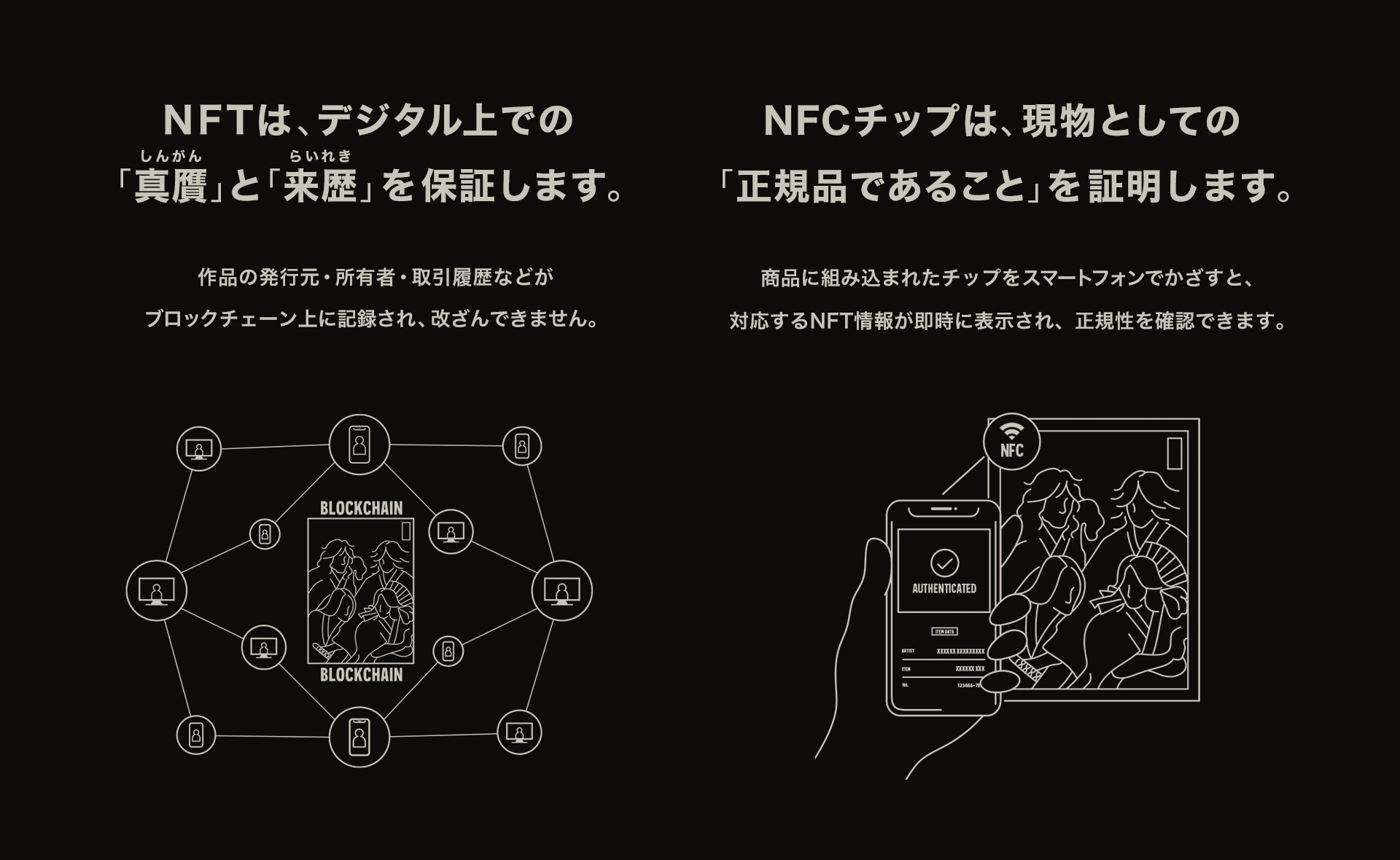 付帯機能: NFT Digital Card(購入証明としてのデジタル証明書)+NFCチップ(正規品証明)+公式二次流通対応