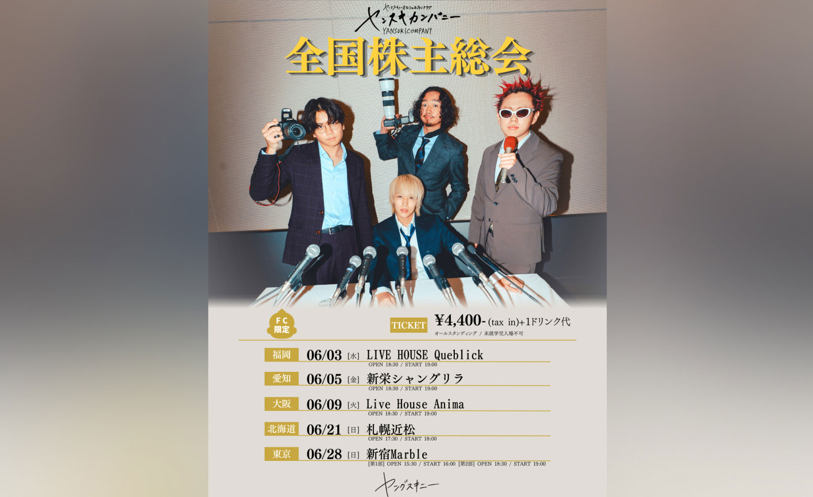 4人組ロックバンドヤングスキニー初のFCツアー、『ヤンスキカンパニー全国株主総会』が開催決定!
