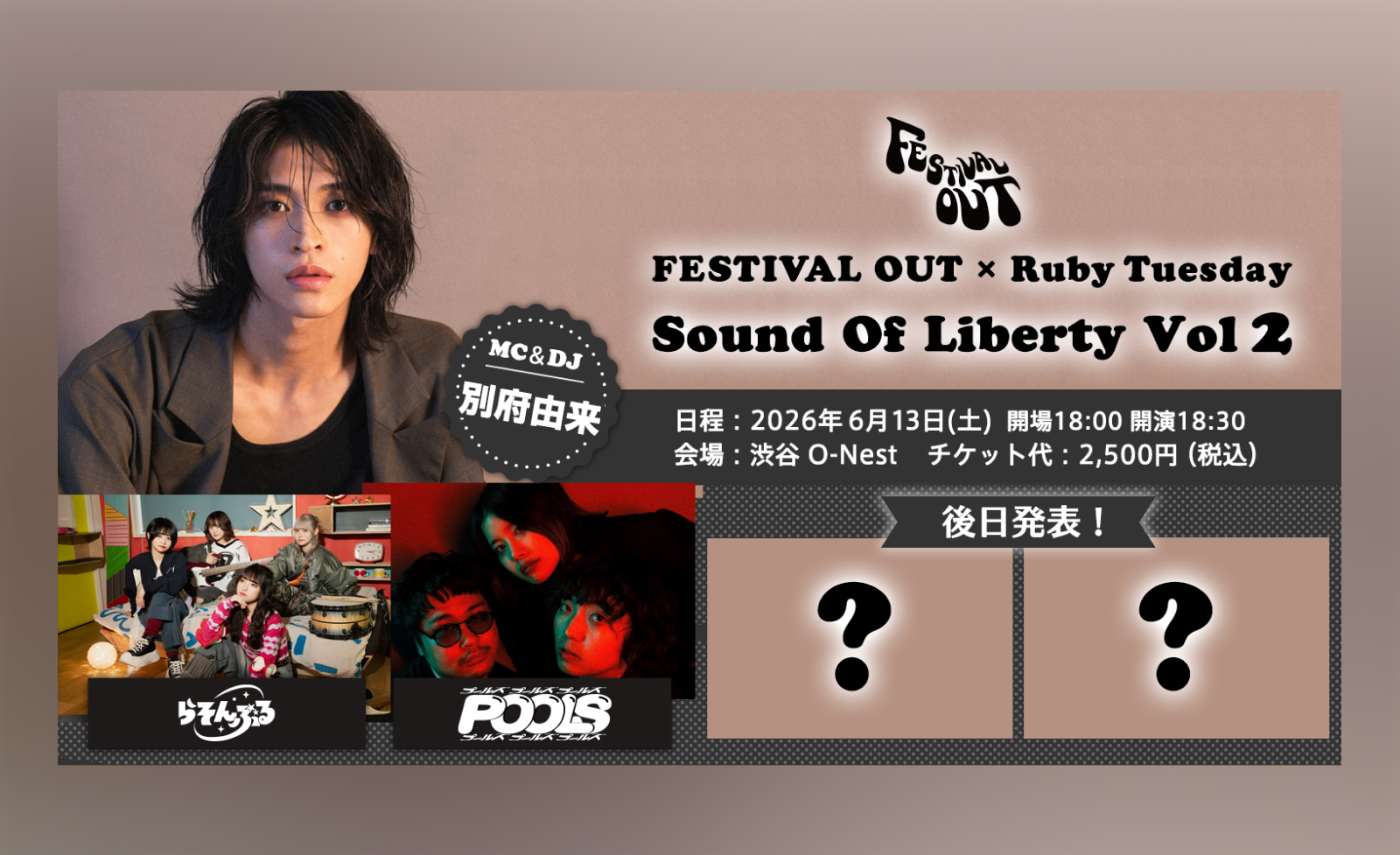 TOKYO FMで毎週金曜21:00から放送中の、音楽フェス・ライブシーンを牽引する番組『FESTIVAL OUT』と、HOT STUFF PROMOTIONが最先端のアーティストを厳選して紹介するライブイベント『Ruby Tuesday』。この両者が再びタッグを組み、2026年6月13日(土)、ライブイベントFESTIVAL OUT × Ruby Tuesday "Sound Of Liberty Vol.2"を開催することが決定しました。